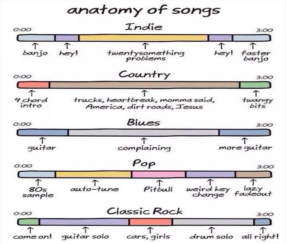Anatomy of songs is a comic by wrong hands cartoonist john atkinson that breaks down the musical genres of the indie rock country blues pop and classic rock into their most basic elements. A song may have a number of verses depending on the form consisting of several lines each. Riffs are repetitive melodic parts of the harmonic structure of a song played within a strict framework and solos are placed in the middle of the song where the guitarist shows off hisher speed and dexterity in a prolonged improvisational section just after the 2nd chorus.