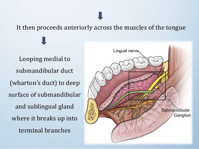 It also carries fibers from the facial nerve which carries taste information from the anterior two thirds of the tongue via the chorda tympani. Anatomy of the lingual nerve the lingual nerve is a branch of the mandibular division of the trigeminal nerve supplying the anterior two thirds of the tongue and responding to stimuli of pressure touch and temperature image 1 2. It supplies feeling to the floor of your mouth and the front two thirds of the tongue.