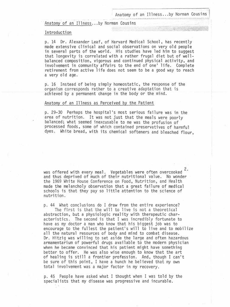 Anatomy of an illness was the first book by a patient that spoke to our current interest in taking charge of our own health. Biopic of saturday review editor and political journalist norman cousins who developed and promoted a self made health therapy consisting of intake of large quantities of vitamin c and making oneself laugh as much as possible. Anatomy of an illness is the story of norman cousins and his successive fight against a crippling disease.
