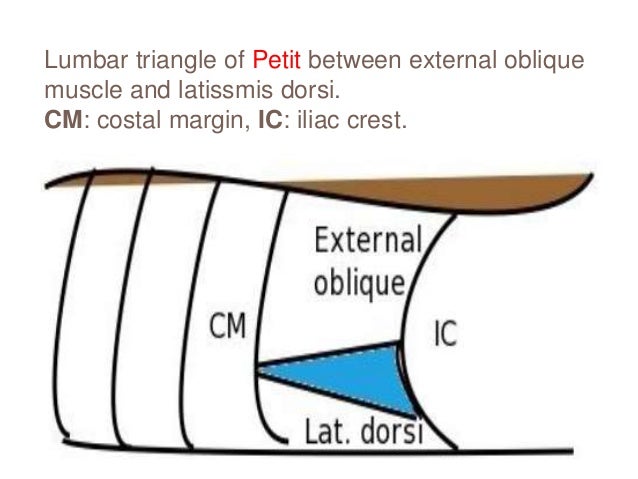 12 this is an area bounded by the latissimus dorsi muscle posteriorly the external oblique muscle anteriorly and the iliac crest inferiorly the base of the triangle. It has a high margin of safety and is technically simple to perform especially under ultrasound guidance. A needle is inserted perpendicular to all planes looking for a tactile endpoint of two pops.