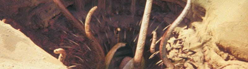 Return of the jedi. The sarlacc rests in the sandy well known as the great pit of carkoon buried except for its massive mouth and beaked tongue.