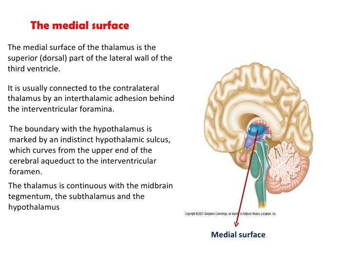 The medial surface of the thalamus forms the upper part of the lateral wall. Structurally the thalamus is composed of two symmetrical egg shaped masses thalami which are usually connected at the midline by a band of grey matter the interthalamic adhesion.